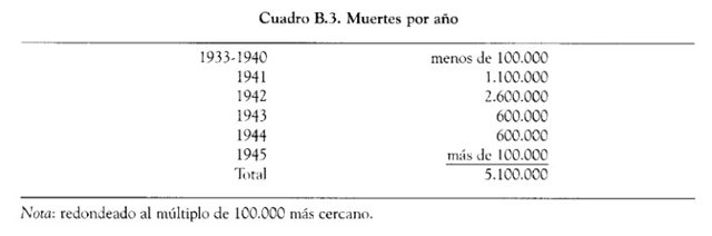 El objetivo de aniquilar a todos los judíos de Europa, como se proclamó en la conferencia en la villa Am Grossen Wannsee en enero de 1942, no se alcanzó. Sin embargo, los seis millones de víctimas de asesinato hacen del holocausto un crimen único en la historia de la humanidad. El número de víctimas –y con certeza lo siguiente representa el número mínimo en cada caso– no puede expresarlo adecuadamente. Los números son demasiado abstractos. Sin embargo, deben indicarse para aclarar la dimensión del genocidio: 165.000 judíos de Alemania; 65.000 de Austria; 32.000 de Francia y Bélgica; más de 100.000 de los Países Bajos; 60.000 de Grecia; el mismo número de Yugoslavia, más de 140.000 de Checoslovaquia; medio millón de Hungría; 2.2 millones de la Unión Soviética y 2.7 millones de Polonia. A estos números deben agregarse todos los muertos en los pogromos y las masacres en Rumania y Transitrien (más de 200.000) y los judíos deportados y asesinados de Albania y Noruega, Dinamarca e Italia, de Luxemburgo y Bulgaria.