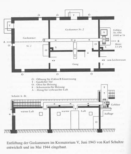 Finalmente, y más determinante aún, existen planos del sistema de ventilación que los nazis emplearon en las cámaras de gas de los crematorios IV y V.