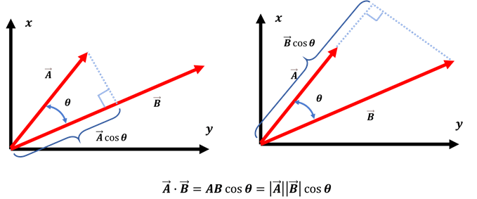 Para obtener dicho producto escalar A→ • B→ se dibujan las flechas de los vectores A→ y B→, con el origen en el mismo punto. El valor del ángulo entre ambos se hallará entre 0 y 180 grados. Y la definición del producto es la magnitud de A→ multiplicada por la componente de B→ paralela a A→; o, la magnitud de B→ multiplicada por la componente de A→ paralela a B→.