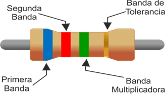 Estos resistores fijos con tolerancias de valor del 5 o el 10% se suelen codificar a través de cuatro bandas de color que indican la tolerancia y el valor de resistencia. Tal sistema de bandas se observa en la siguiente imagen: