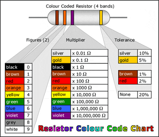 La primera banda es la más cercana a un extremo del resistor, o –en caso de que no esté claro cuál es el extremo más cercano a una banda–, aquella que no es de color plata ni oro. La segunda banda es el segundo dígito del valor de resistencia, la tercera el número de ceros que va después del segundo dígito, y la cuarta da cuenta de la tolerancia, en porcentaje, de la resistencia real. Para el caso del resistor de la imagen anterior, la resistencia sería, a partir de la tabla expuesta debajo de dicho resistor, de 130.000.000 Ω con una tolerancia de 5%; es decir, que el valor de la resistencia real puede ser mayor o menor a la cifra antes dada hasta en un 5%. Para resistencias menores a 10 Ω vemos que la tercera banda deberá ser de color oro o plata, multiplicadores de 0.1 Ω y 0.01 Ω respectivamente.