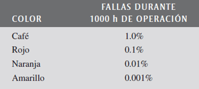 Otro grupo de resistores de cuatro bandas tiene una quinta extra que indica la confiabilidad en un porcentaje de falla por cada 1000 horas, de acuerdo con la siguiente tabla. Así, una quinta banda roja en un resistor de 4 bandas de color significa que si un grupo de resistores similares se pone a operar en condiciones estándar a lo largo de 1000 h, el 0.1% de los resistores fallará.