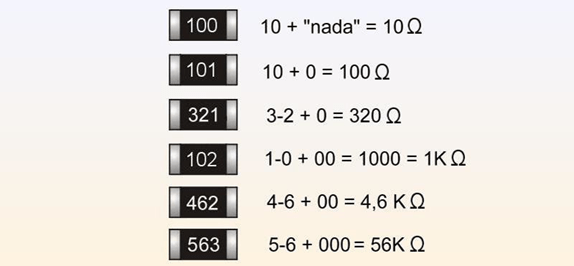 Para la rotulación numérica, se utilizan tres dígitos para indicar el valor de resistencia. Los primeros dos proporcionan los primeros dos dígitos de dicho valor, en tanto que el tercero, como multiplicador, señala la cantidad de ceros que va después del segundo dígito. Esta rotulación se usa para valores de 10 Ω o más.