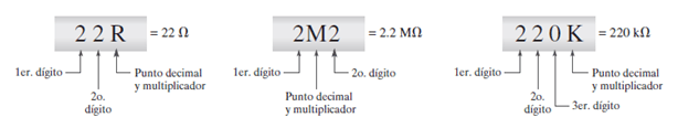 Ejemplos de resistores con rotulación alfanumérica.[6]