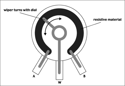 El potenciómetro es un dispositivo de tres terminales, teniendo los primeros 2 un valor de resistencia fijo entre ellos, que es la resistencia total, mientras que el terminal tres está conectado a un contacto móvil o rozador, que, subiendo o bajando, permite la variación de la resistencia entre 3 y 1 o 3 y 2.