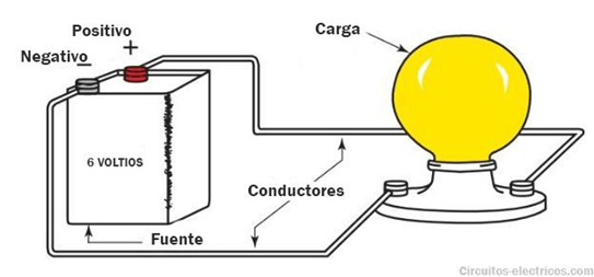 Todo circuito, en su forma básica, debe estar compuesto por una fuente de tensión, una carga y una trayectoria para la corriente entre la fuente y la carga. En la imagen siguiente, la batería constituye la fuente de tensión, la lámpara es la carga que absorbe la corriente de la batería, y los conductores proporcionan la trayectoria necesaria para que la corriente vaya, siguiendo la convención, desde el terminal positivo de la batería hasta la lámpara y de regreso al terminal negativo. La corriente pasa por el filamento de la lámpara, que tiene resistencia, y ello produce la luz visible.