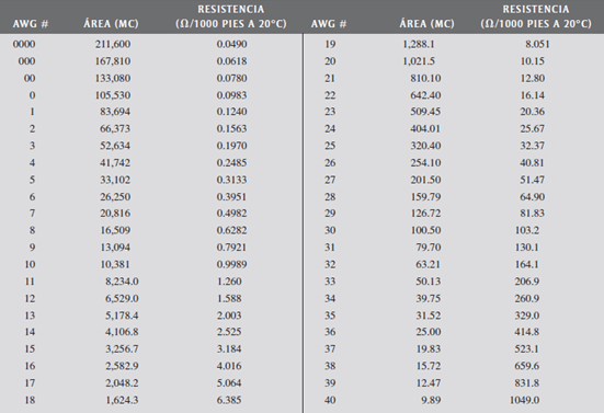 En los circuitos eléctricos, los alambres son el tipo más común de conductores. Éstos varían en diámetros y suelen ser ordenados con arreglo a números de calibre estándar, denominados tamaños AWG (por American Wire Gauge). A medida que el número de calibre asciende, el diámetro del alambre disminuye. El tamaño de los alambres también se especifica a partir de su área de sección transversal. Una unidad utilizada para tal propósito es el mil circular, abreviado MC. Un mil circular es el área de un alambre con diámetro de 0.001 pulgadas. Para hallar el área de sección transversal de un alambre, se eleva al cuadrado el diámetro expresado en milésimas de pulgadas.